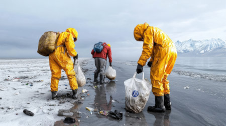 Dedicated environmental activists in yellow protective suits collect trash along a beach, highlighting pollution issues and the importance of community efforts in coastal cleanup.