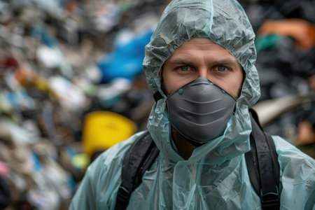 Worker in protective suit at landfill site sorts hazardous waste, wearing protective gear for safety and preventing infection.