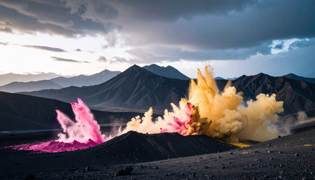Realistic abstract explosion of vibrant pink and yellow holi powders on matte black surface, festival celebration concept