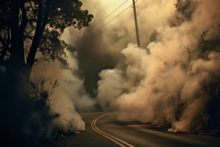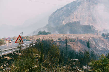 Mysterious Smoke land road. Big burned area turning gray pile ash and darkness. Generate AI