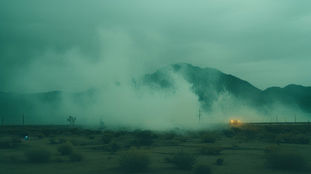 smoke billows from distant mountains, creating an auto-destructive art-inspired scene. the light teal and yellow hues add an atmospheric touch to the desertwave ambiance. the chiaroscuro portraitures capture the essence of abandoned spaces, reminiscent of california impressionism. ai generated