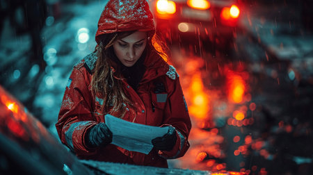 A resolute firefighter in protective attire maintains intense focus amidst pouring rain, with emergency lights and distant homes softly blurred behind.