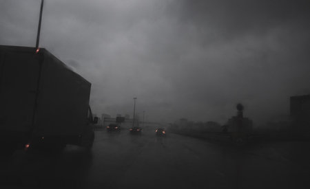 noir photo of cars on the highway in the evening in a storm