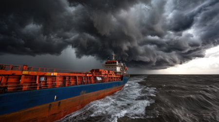 A striking image of a cargo ship navigating through turbulent waters beneath a dramatic sky filled with dark, foreboding storm clouds.
