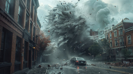 A fierce storm engulfs the city, with dark clouds swirling and debris spiraling through the air. Buildings tremble under nature's wrath while vehicles are tossed like toys on the tumultuous streets.