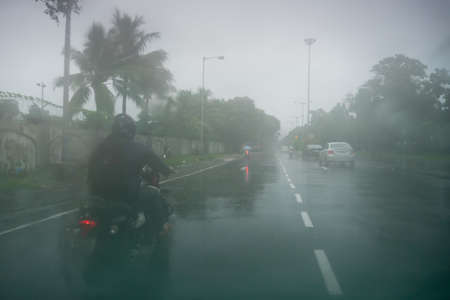 Image shot through raindrops falling on wet glass, abstract blurs of traffic - monsoon stock image of Kolkata (formerly Calcutta) city ,