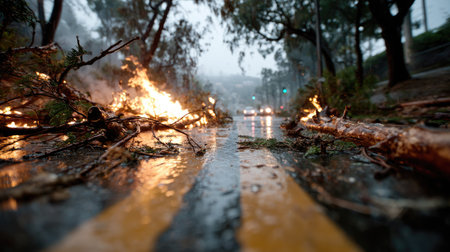 A dramatic scene depicting fallen trees and flames on a wet asphalt road during stormy weather, creating a sense of danger and urgency.