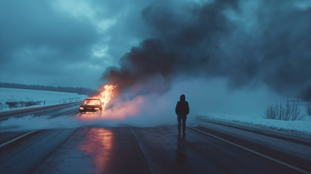 Car accident on icy road, black vehicle engulfed in smoke and flames, two individuals standing nearby, one wearing black jacket and another white shirt.