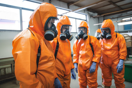 Group of Individuals in Protective Suits and Gas Masks Preparing for a Hazardous Situation in a Dimly Lit Underground Facility. Generative AI