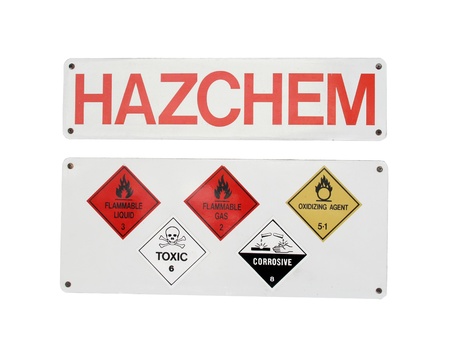 Close up on red Fire sign with 3494 fire symbol and white toxic inhalation hazard sign, warning signs on metal tank truck back