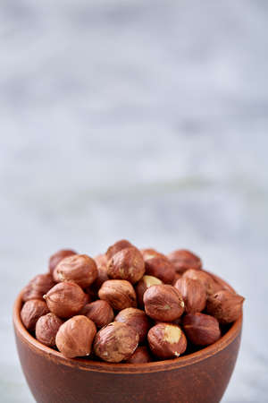 Hazelnuts in clay ceramic bowl on white textured background with copy space, top view, close-up, selective focus, shallow depth of field. Nutritious organic snack. Vegetarian protein. Seasonal antioxidant. Healthy food concept.