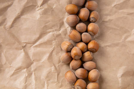 Shelled hazelnuts on brown rough crumpled kraft paper. Food background, top view