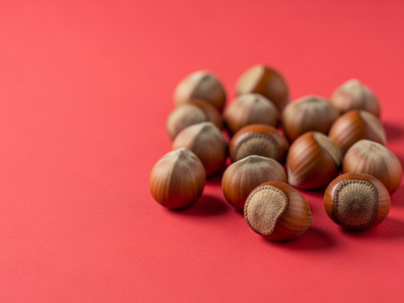 Hazelnuts on a beautiful red painted plate. Hazelnuts in shell, healthy food