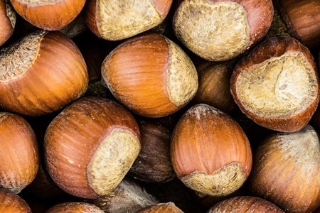 Closeup of whole hazelnuts in a rustic setting, showcasing their benefits for a healthy diet and nutrition, ideal for health-conscious food visuals