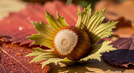Detailed Close-Up of Textured Hazelnut Against a Bright Yellow Background in Autumn Harvest Scene