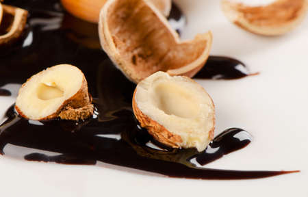 Hazelnuts and sweet chocolate sauce . Selective focus