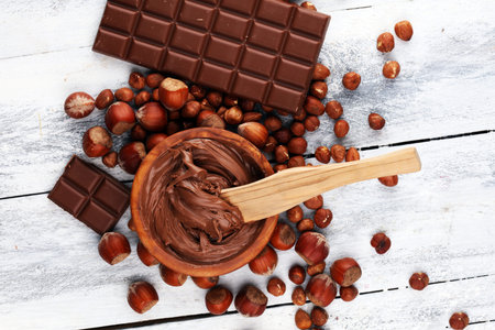 Sweet chocolate cream with bars and nuts on a wooden table. top view