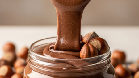 Chocolate hazelnut spread and hazelnuts in jar. Macro food photography.