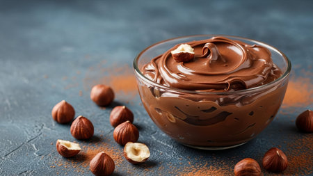 Chocolate hazelnut spread in bowl with nuts, cocoa powder on dark blue surface.