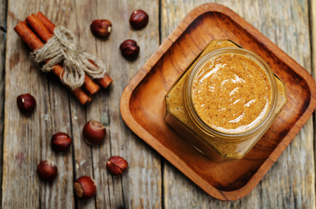 homemade toasted cinnamon hazelnut butter. toning. selective focus