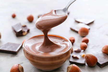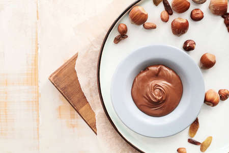 Homemade Chocolate Hazelnut Spread in a Bowl, top view. From above, overhead, flat lay. copyspace.