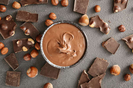 Bowl with tasty chocolate paste and hazelnuts on gray background