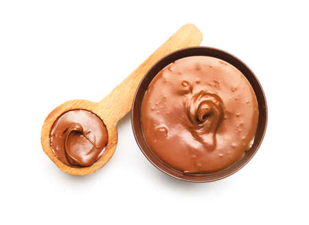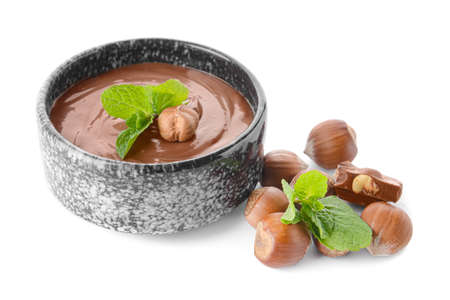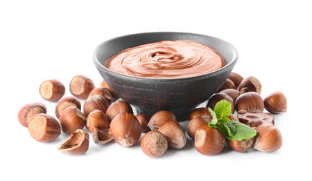 Bowl with tasty chocolate paste and hazelnuts on white background