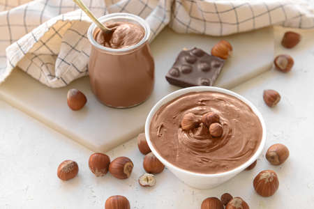 Jar and bowl with tasty chocolate paste and hazelnuts on light background