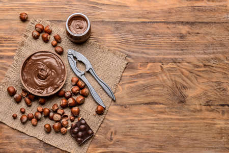 Bowl with tasty chocolate paste and hazelnuts on wooden background