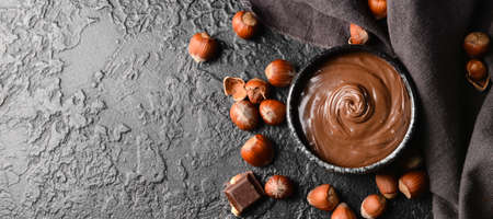 Composition with tasty chocolate paste and hazelnuts on dark background