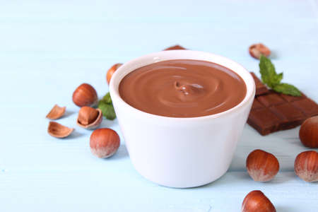 Bowl with tasty chocolate paste and hazelnuts on light background