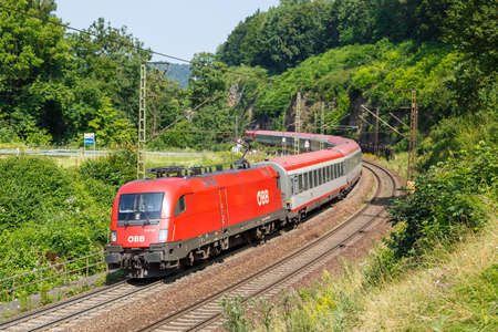 Amstetten, Germany - July 21, 2021: InterCity IC train of ÖBB Österreichische Bundesbahnen on Geislinger Steige near Amstetten, Germany.