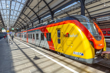 Wiesbaden, Germany - April 4, 2023: people wait in the train station for departure in classicistic train station in Wiesbaden, the smaller copy of Frankfurt Train station.