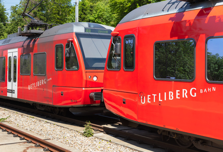 Zurich, Switzerland - June 5, 2019: two locomotives of a train of the Uetliberg railway line standing at the station on the top of Mt. Uetliberg, main focus on the closer one. The Uetliberg railway line (German: Uetlibergbahn) connects the Zurich main rai