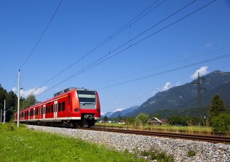 Red commuter train is entering a station of Garmisch Partenkirchen in evening hours, with fantastic background view over the mountains and snowy hills.