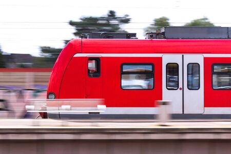 Modern electrical multiple unit train on track on a suburban station. Commuter train rushing towards the city in a suburban environment on a sunny day.