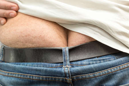 Saggy belly. Folds of leather and fat on the side hanging over the waist of the jeans. A figure spoiled by overeating or pregnancy. Obesity and Diabetes. Unhealthy Lifestyle. Cellulite flabby muscles.