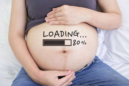 Pregnant asian woman sitting on bed and touching her big belly, Countdown drawing loading text