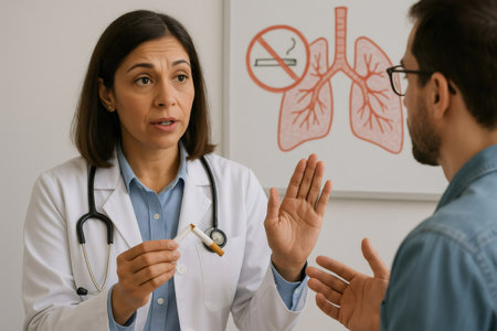 Female doctor showing broken cigarette and explaining lung health to male patient during smoking cessation consultation