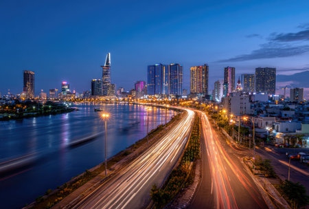 Aerial cityscape of Saigon at beautiful nightfall sky in evening
