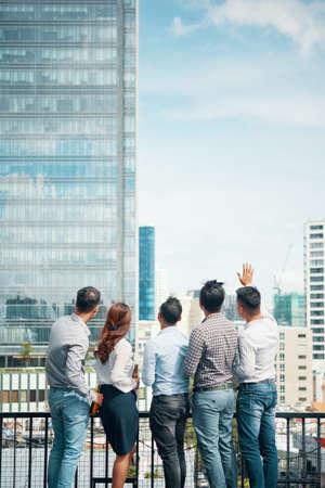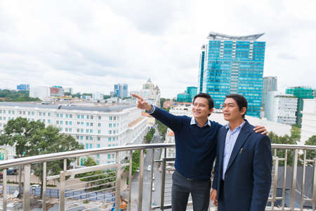 Vietnamese businessman pointing at something to his colleague while they are standing on the roof of the building