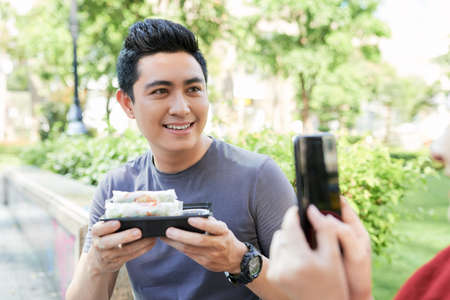 Woman taking photo of boyfriend with traditional Vietnamese spring rolls
