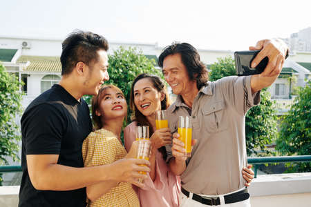 Happy mature Vietnamese couple and adult children photographing together outdoors with glasses of orange juice in hands