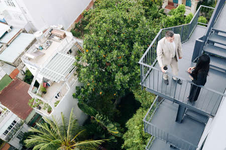 Business people having serious conversation on fire escape staircase of office building, view from above