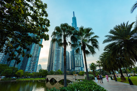 Ho Chi Minh City, Vietnam - November 08, 2022: Landmark 81, a building in Saigon. Landmark 81 among other high-rise buildings of Vinhomes Central Park urban area with a lawn and palm tree alley