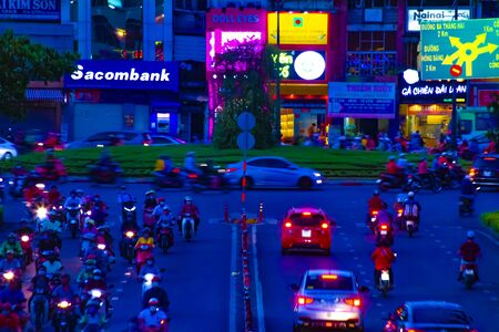Ho Chi Minh City, Vietnam – 2019. Motorbike traffic in motion on the streets of the downtown area of Ho Chi Minh.