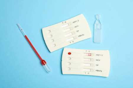 Two disposable express tests for hepatitis on light blue background, flat lay