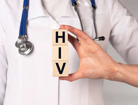 doctor hands in medical gloves hold wooden cube blocks with HIV Human Immunodeficiency Virus acronym isolated on white background.
