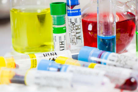 Hiv and aids infection blood test sample, diagnoses and laboratory chemical liquid elements, studio shoot on the white background