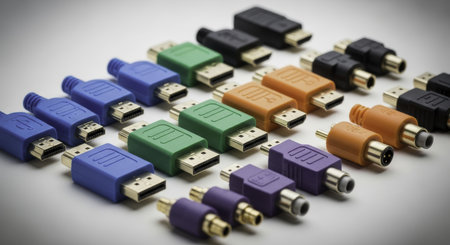 Assortment of colorful electronic connectors, including HDMI, DVI, and s video adapters, neatly arranged on a light surface, representing modern data transfer and connectivity solutions.